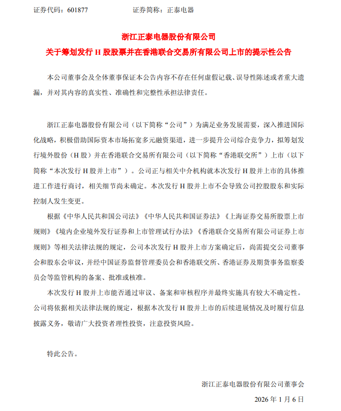 1月5日,正泰电器(601877.SH)公告称,公司为满足业务发展需要,深入推进国际化战略,积极借助国际资本市场拓宽多元融资渠道,拟筹划发行境外股份(H股)并在香港联合交易所有限公司上市。公司正与相关中介机构就本次发行H股并上市的具体推进工作进行商讨,相关细节尚未确定。本次发行H股并上市不会导致公司控股股东和实际控制人发生变更。